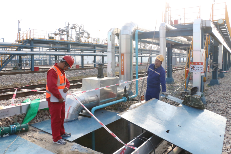 炼化党支部委员、副总经理乐德俊,党员、硫磺车间设备管理员徐蕾检查并监护老装置原料水与净化水换热器管束清洗情况。