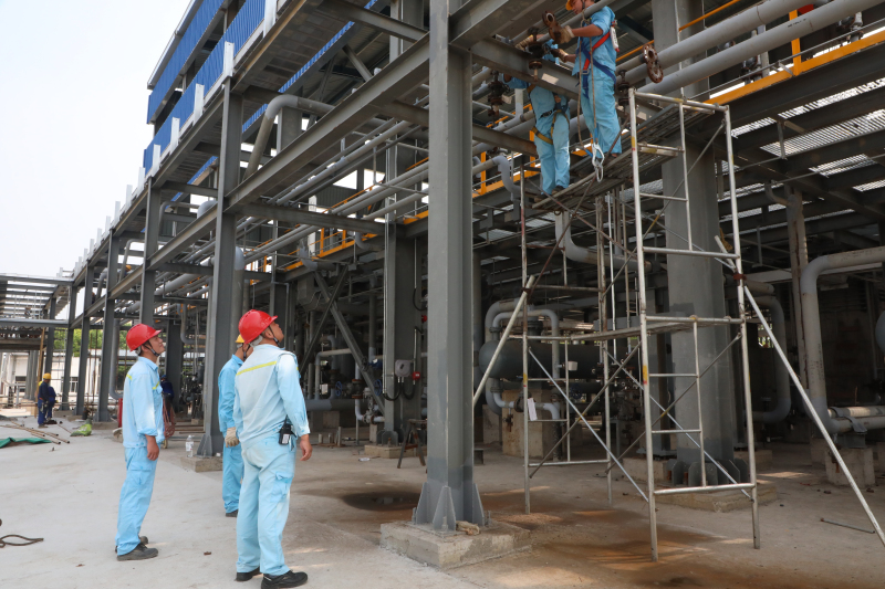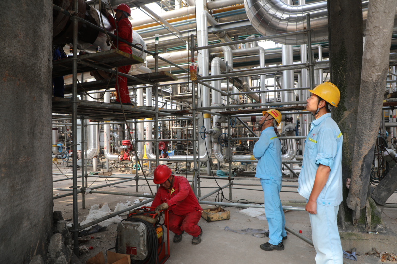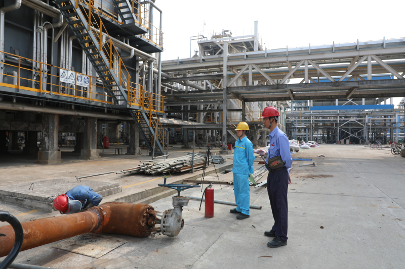 改质车间操作员吴文明、易念在改质装置检修现场对反应器出口螺栓紧固作业进行安全监护。