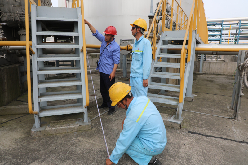 储运党支部书记、油品储运一公司总经理张大立,机修车间操作员何祥生、刘宝树在3022罐区对仪表应急过桥进行测量并商讨确认整改方案。