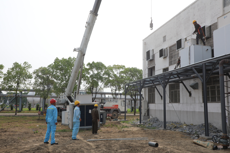 电工车间副主任郑郅在异辛烷高压变频器室对空水冷设备吊装进行现场指挥。