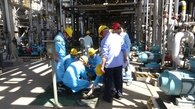 维修车间化工班组织新员工在芳构化装置现场学习吸收塔底泵检修工序和质量标准。在检修过程中,班长晏璐带领新员工仔细查看吸收塔底泵的重点部位,他结合工作经验,耐心细致地为大家讲解检修注意事项和操作方法,通过拆卸、清洗、检查、更换等一系列操作,吸收塔底泵的故障得到了修复。这次检修工作不仅提升了班员的实践操作能力,也为芳构化装置的稳定运行奠定了基础。