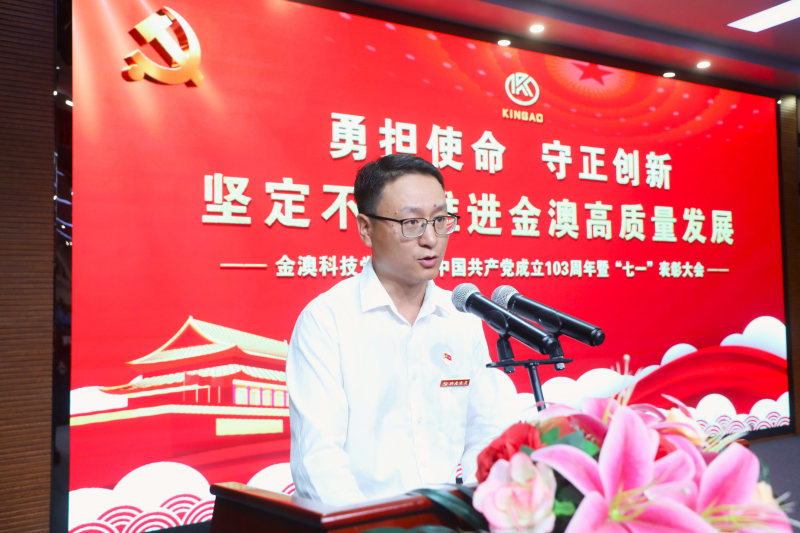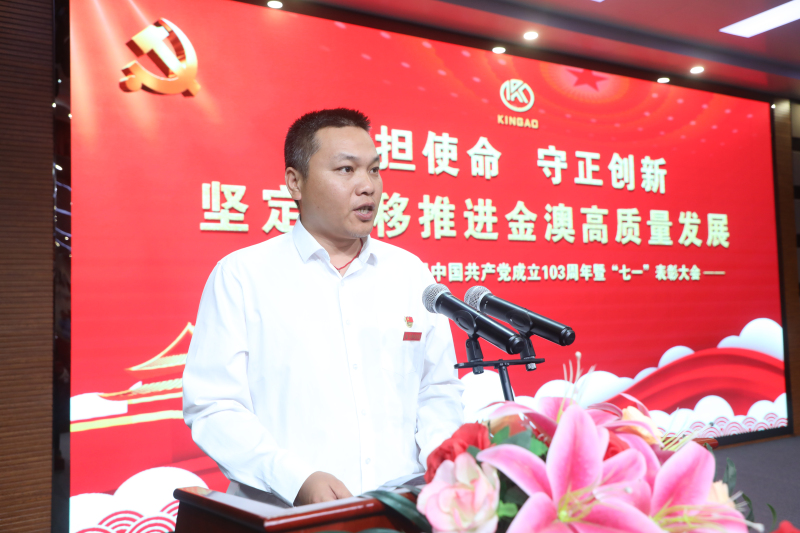 【概要描述】6月28日晚,金澳集团在多功能厅隆重召开庆祝中国共产党成立103周年暨“七一”表彰大会。金澳集团执行总裁吴让生,金澳科技党委书记、轮值总裁肖生强,党委副书记、副总裁王自力等在家高管、各党支部党员、入党积极分子,部分副科级及以上管理干部参加