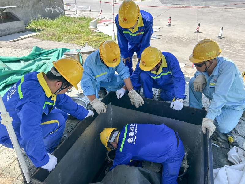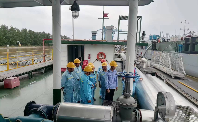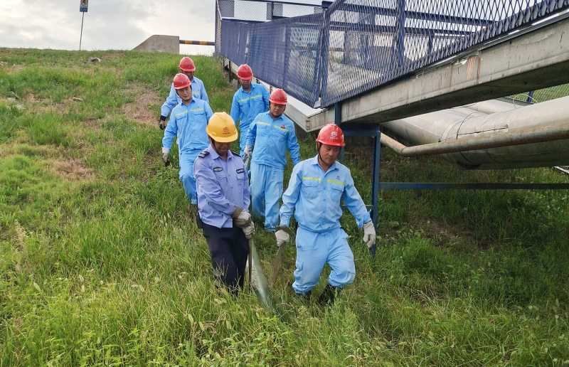 物流公司副总经理谢胜良组织油库管理人员对大堤内侧管线进行检查并更换转运。